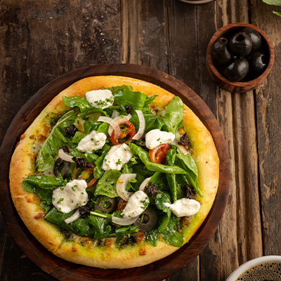 ARUGULA, PEANUT BASIL PESTO AND RICOTTA by Haris&Co | Dec 30, 2025 Topped with arugula, cherry tomatoes, sundried tomatoes, olives, fresh onions, ricotta and parmesan cheese.