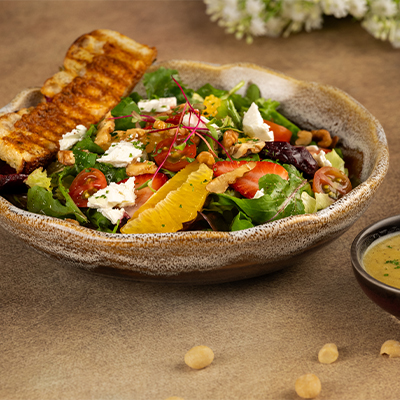 tomatoes, orange segement, strawberry, feta cheese and walnuts,