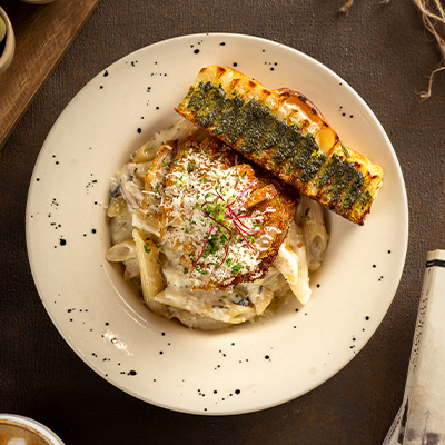 creamy mushroom sauce, topped with parmesan crusted chicken strips.